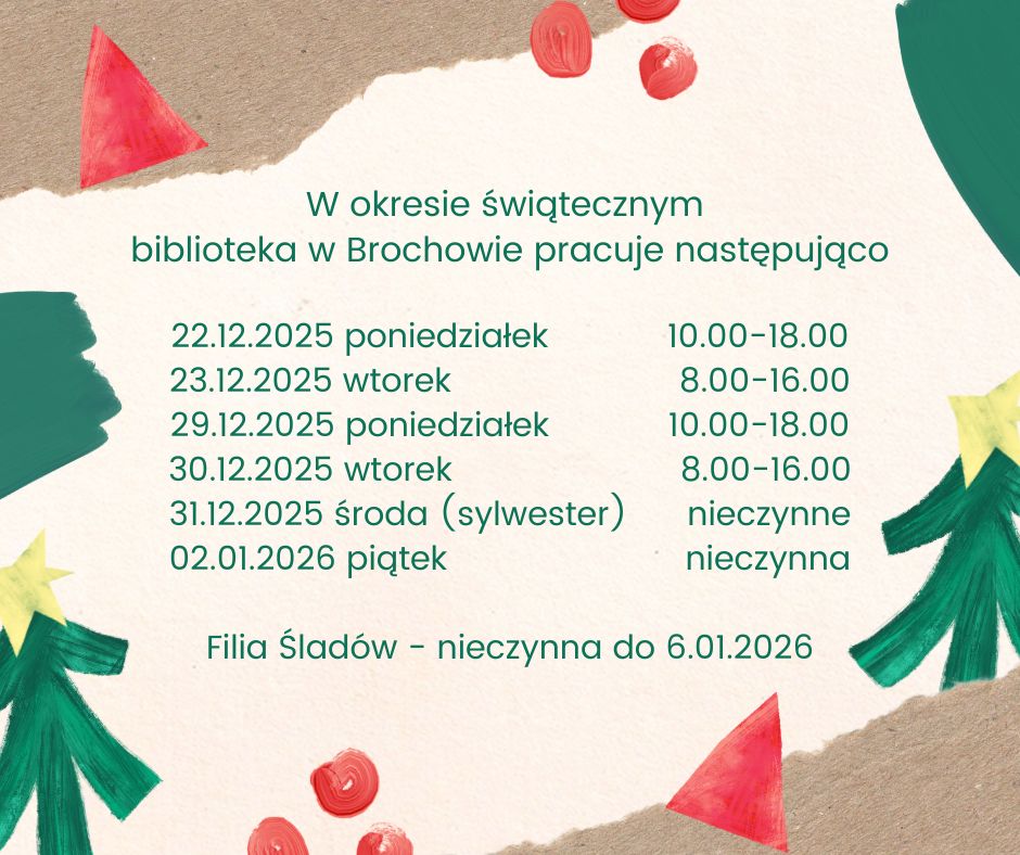 Autor: adminOpublikowano 2025-12-19Opublikowano w Bez kategorii Drodzy czytelnicy informujemy, że biblioteka w okresie świątecznym pracuje następująco Nawigacja wpisu Zajęcie świąteczneŻyczenia Świąteczne