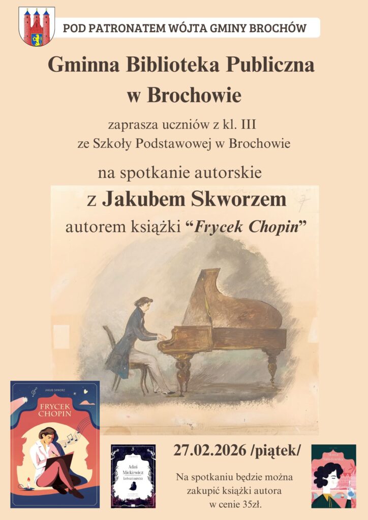 Z tej okazji odwiedzi nas autor książki „Frycek Chopin” Jakub Skworz! spotkanie dedykowane dla uczniów z kl.III ze Szkoły Podstawowej w Brochowie w podziękowaniu za ich chopinowski kącik:) ![]()
